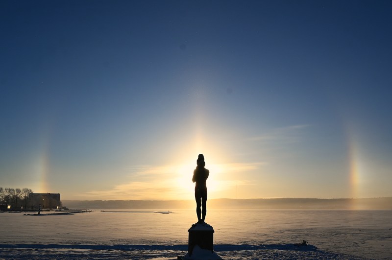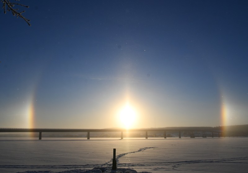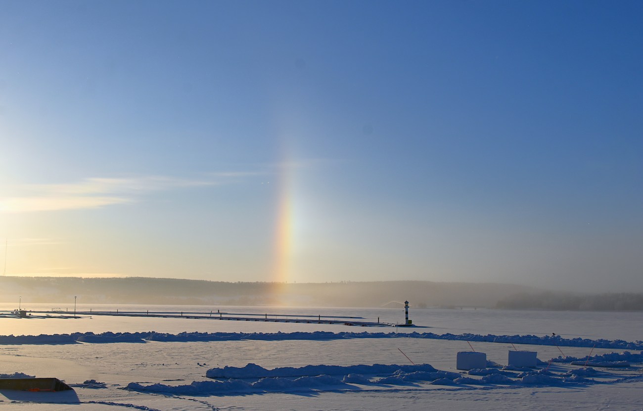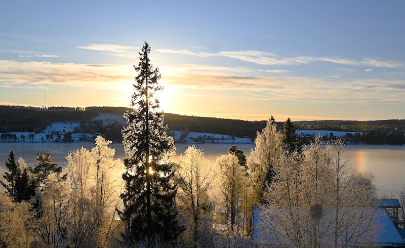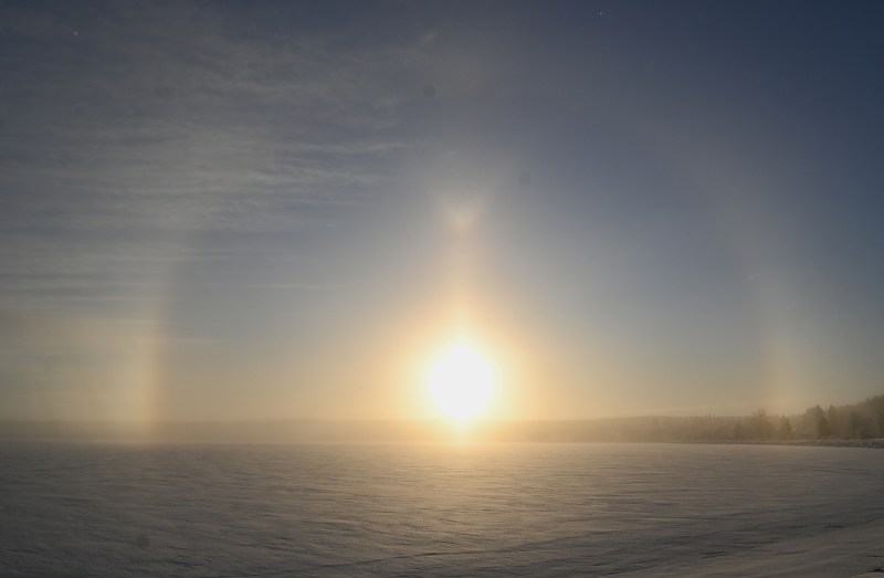 Det var en fin början på året. Isen hade nyss lagt sig och den lågt stående solen kom fram över Annersia några timmar de dagar den alls visade sig. Den skarpögda kan se en liten regnbågsliknande pelare långt till höger och så brukar det se ut när en halo inte blir hel utan bara visar sig som just en sådan liten pelare. Det fanns förmodligen en likadan åt andra hållet men den syns inte i den här bilden.