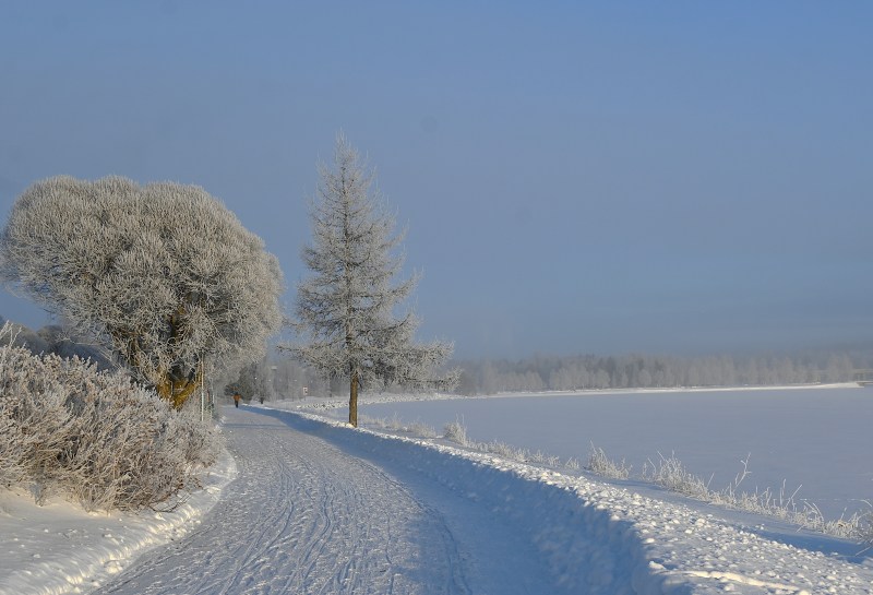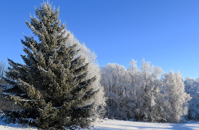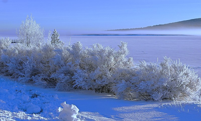 Där dimman hade nått träden gjorde kylan att fukten frös fast i träden.
