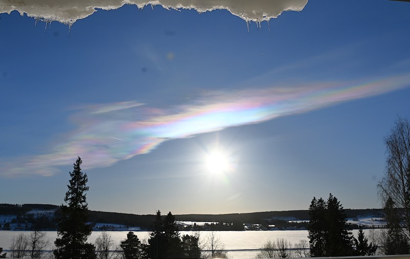 Jag väntade till efter elva på förmiddagen innan jag gjorde mig i ordning och gick ut. Tyvärr var det lite för mulet söderut för att den där tjusiga halon skulle ha en chans. Men ni kan ana att den gör små försök. Kanske blev den mer synlig någon annanstans. Jag väntar fortfarande på att den ska visa sig för mig någon gång. Jag har sett en hel halo två gånger men då har den varit nästan helt vit och inte så stor.
