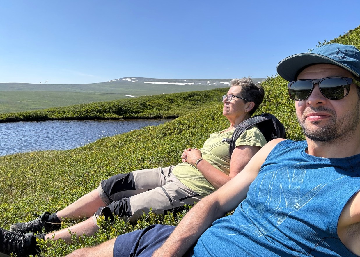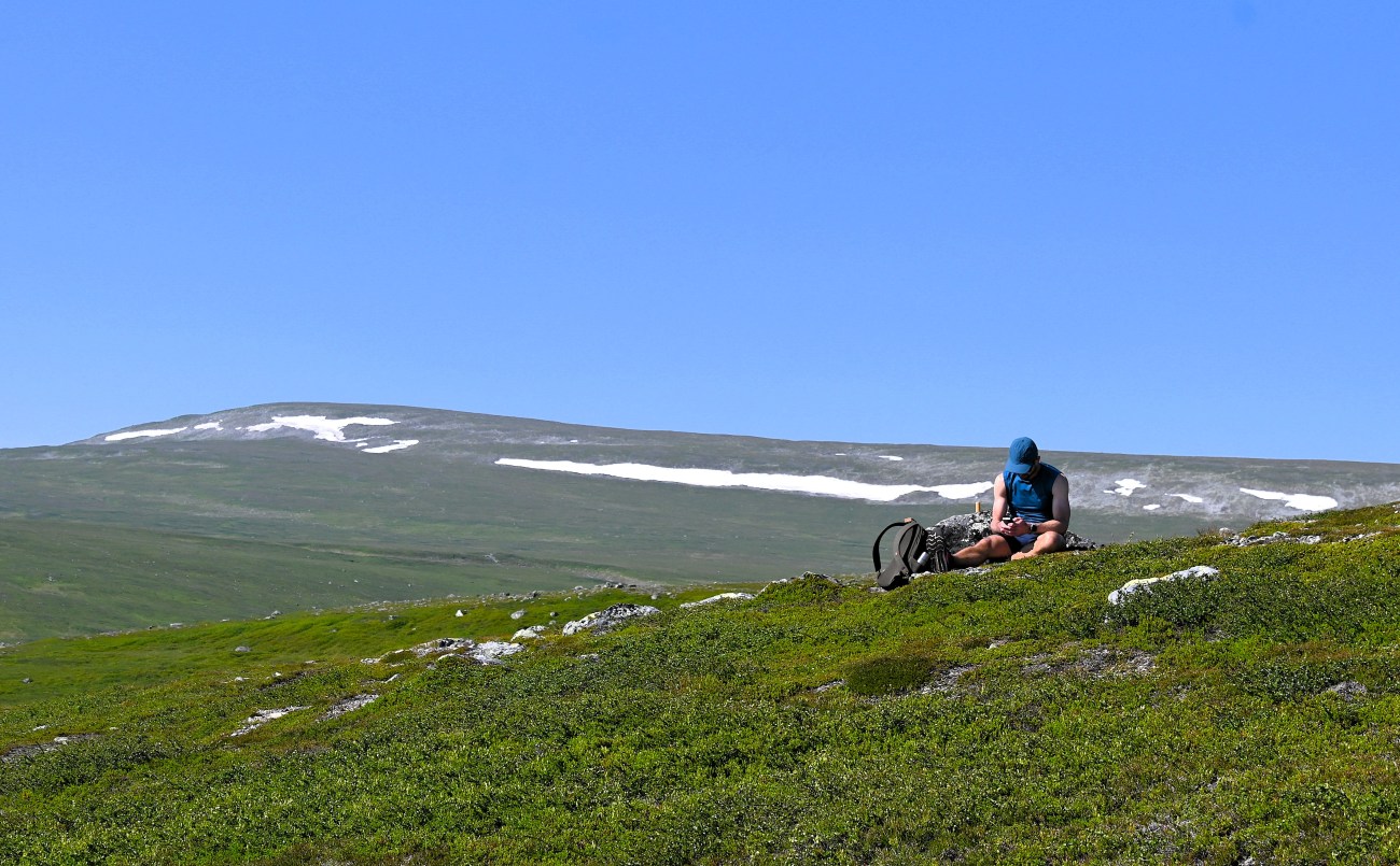 Att ta sig tid till att njuta är viktigt. Man kan t ex lägga sig ner en stund, när man har fått så många fina intryck, och bara uppskatta att få vara där man är. Min dotter gjorde mig sällskap och där låg vi, blundade och mådde bra. Vi tog många små pauser, nödvändiga vilopauser och en del andäktiga pauser. Precis så tycker jag att en härlig dag i fjällmiljö ska vara.