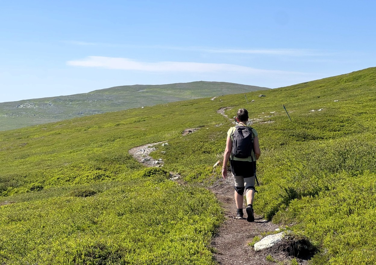 Jag hade tidigare bestämt mig för att foten fick bära eller brista under den här resan. Vila och träning hade hjälpt en del men helt bra blev det inte. Här tänkte jag inte låta det problemet bestämma.Efter en övernattning i Arvidsjaur fortsatte vi mot slutmålet. Det pirrar alltid i mig när jag kommer in i fjällvärlden och har vyer som den här omkring mig.