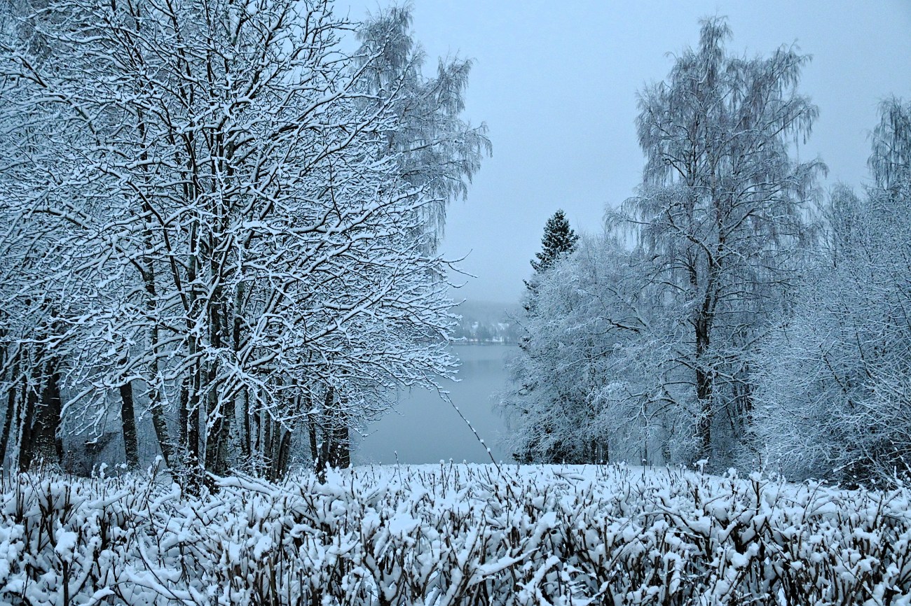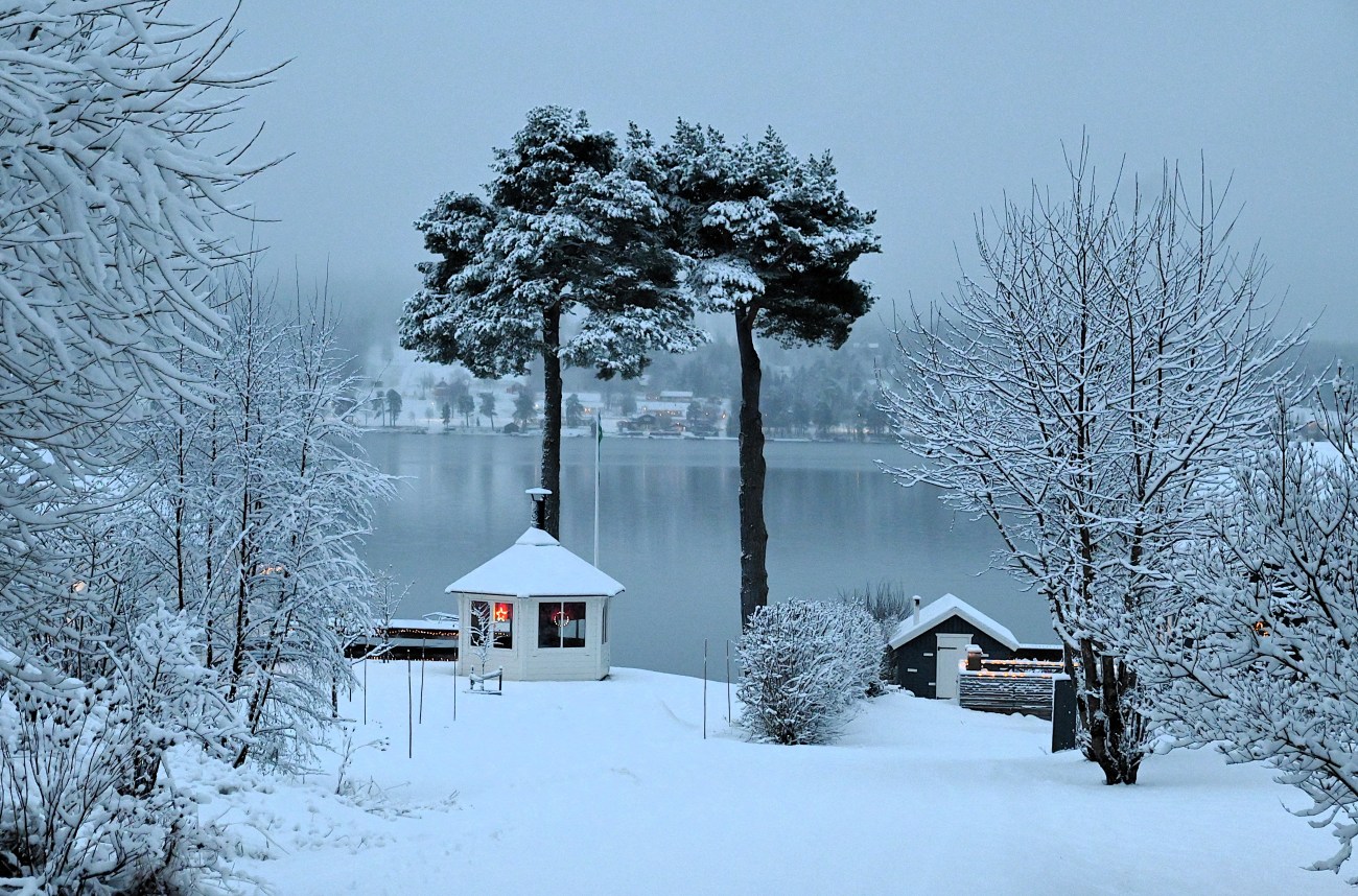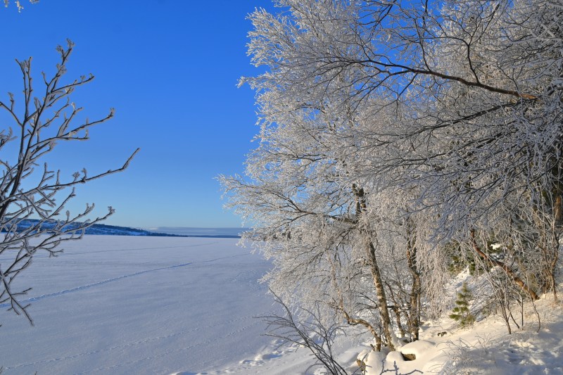 Snön kom och hos mig var inte snöovädret Anna ett oväder utan mer ett vanligt snöfall. Jag gillar ju vinter som ni vet så jag blev glad. På eftermiddagen den 2:a januari såg jag små tecken på att is började bildas på sjön. Jag vågade inte hoppas för mycket eftersom det bara krävs lite vind för att vågorna ska svepa bort den is som är på gång att bildas. Men under natten frös den till ordentligt och på morgonen såg det ut så här. Exakt samma datum som förra året. Jag tänkte att jag inte skulle bli förvånad om jag snart skulle få se skridskoåkare där ute men tack och lov så verkade det som om de ville vänta åtminstone ett dygn. Men isen blir tjock ganska snabbt när minusgraderna är många.