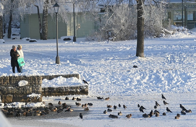 När jag stod på gångbron till Badhusparken var några vänliga tjejer där och kastade ut mat till fåglarna. Det är synd om alla djur som måste vara ute i kylan.