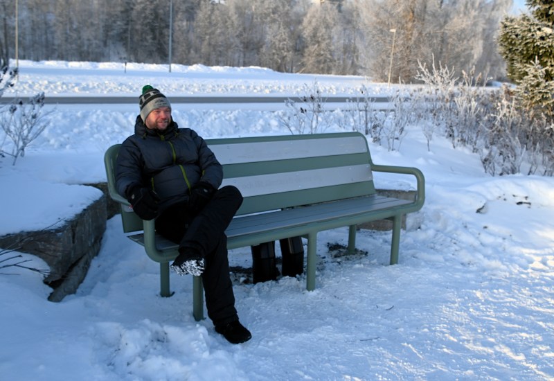 Det här är en speciell bänk och det finns bara tre stycken i Östersund. Jämtkraft har installerat dessa tre bänkar med inbyggd infravärme, ca 38 grader är det som kan värma frusna rumpor en stund. Det är överskottsvärme från fjärrvärmens returledningar och bara en liten del går till bänkarna. Projektansvariga säger att de vill ge något tillbaka till kommuninvånarna eftersom det har varit lite stökigt när fjärrvärmen har byggts ut. Jag slog mig ner en stund på bänken och det var faktiskt en skön värme. En liten pratstund blev det med min bänkgranne och när jag sa att jag skulle fota men inte så att han kom med så sa han att det gjorde inget alls om han blev fotad där på bänken. Så blev det och jag tackade och gick vidare.