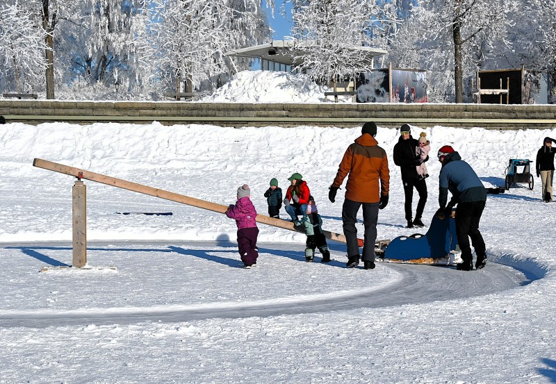 Jag skrattade lite för mig själv åt att det tydligen var roligare för de här barnen att skjuta på än att åka i kälken. Jag passade på att fota när de vände ryggarna till. Ännu hade ingen satt sig på den långa bänk som finns längs hela muren i bakgrunden. Men den kommer att användas flitigt när solen värmer mer.