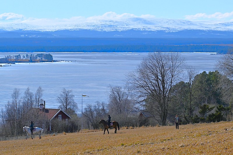 Jag kom ut på öppna fält igen och när jag vid ett tillfälle vände mig om såg jag några hästar och deras ryttare. Bilden är tagen på väldigt långt avstånd . Plötsligt vände de om och i full galopp tog de sig uppför den långa sluttningen.