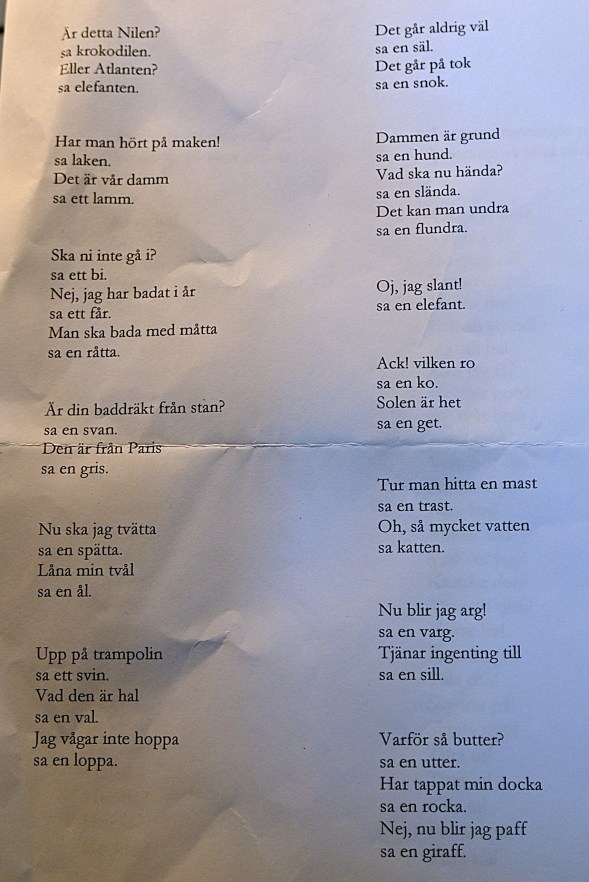 Men kanske kan även de här problemen fixas. Jag och logopeden la händerna på våra magar och gjorde några nya övningar. Det såg ganska kul ut när logopeden gjorde samma sak eftersom hon är gravid i 9:e månaden men hon sa att bebisen där inne inte reagerade på de här övningarna. Nu hade jag hjälp av att jag en gång i tiden har sjungit i kör och kan hitta magstödet, dvs diafragman. När man säger ord, fraser eller uppmaningar så gäller det att med en relativt kraftig stöt dra in magen samtidigt. Jag har fått tre A4-sidor med olika saker jag ska öva att säga samtidigt som jag gör det här. Jag konstaterar att det märks att de har mest med barn att göra men jag läser alla meningar samtidig som magen snabbt trycks in. Men jag börjar med enstaka ord och uttryk innan jag kommer till den här sidan. Jag gör en hel del styrketräning och även magen inkluderas i den träningen men jag kan lova att det känns i magen när jag har gått igenom alla tre papper med alla magindragningar.