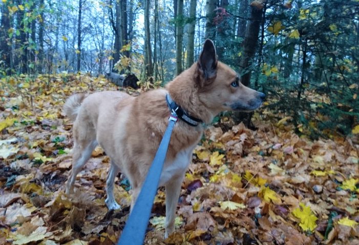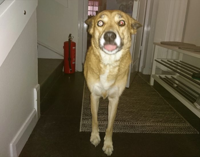 En liten rapport hemma från Sverige igen. Kaya är en väldigt rar vovve med massor av charm men någon bra fotomodell är hon inte. Hon är så fin med ett brunt och ett blått öga men hon totalvägrade att visa det. Jag ville inte krångla med henne så det fick bli som det blev. Ett enda foto fick jag med mobilen där hon tittade rakt på mig. Men det var ett totalt misslyckat foto där blixten gick av utan att det var tänkt så och hennes ögon blev inte alls som de är. Men det blev en ganska kul bild i alla fall 😀 Undrar om hon grimaserar mot mig med flit 😉 Men först en lite snällare bild.