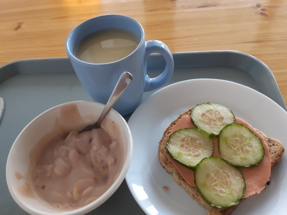 Jag hade bokat ett rum på Kristinebergs B&B och om ni någon gång behöver övernatta i Mora kan jag rekomendera det. Mest imponerad var jag av att frukostutbudet inkluderade både veganskt smörgåspålägg, havredryck till mitt té och havregurt med jordgubbssmak (med müsli i havregurten blev det väldigt gott). Det hade jag inte alls räknat med men kanske var det just den detaljen som fick mig att känna att det är nog där jag ska boka rum hädanefter när jag åker söderut. Jag hade bokat det enklaste rummet med en våningsäng. Men madrassen var skön och jag hade ett eget badrum. 476 kr var inte för mycket för allt som inkluderades och det var även handdukar, sängkläder och städning. Så bra är det inte överallt. Man har dessutom tillgång till ett stort kök och mina kylvaror fick plats i kylskåpet.