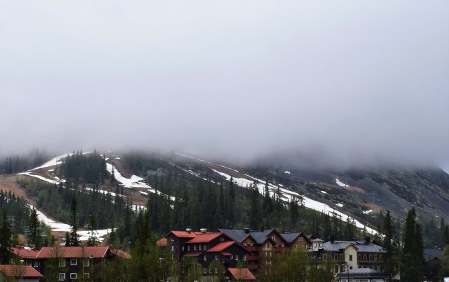 Från Sveg kan man välja att åka en något kortare sträcka via Ytterhogdal eller så väljer man den lite längre men finare vägen förbi Vemdalen, över Vemdalsskalet och vidare förbi Klövsjö. Jag valde fjällen men det var inte riktigt rätt dag för det. Molnen hängde låga och det var inte alls de vyer man annars kan se. Här har jag stannat uppe vid Vemdalsskalet och där såg jag i alla fall de nedre delarna av backarna.