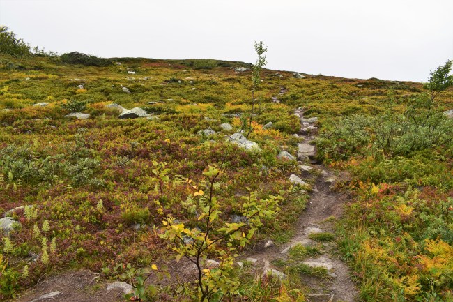 När jag fortsatte lutade det kraftigare uppåt och så var det under större delen av den fortsatta vandringen. Leden varierade mellan att vara stenig, full av rötter eller med stora nivåskillnader mellan stegen. När jag någon kort stund kom till en slät del kändes det väldigt vilsamt för hela rörelseapparaten. Men jag såg att molnen började lätta lite och jag visste att utsikten längre upp skulle vara enastående och värd ansträngningen att ta mig dit.