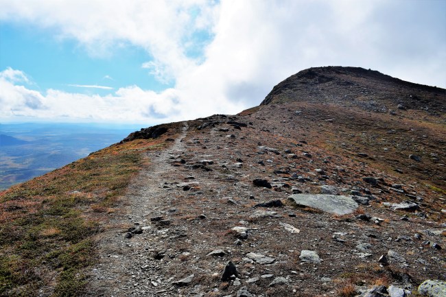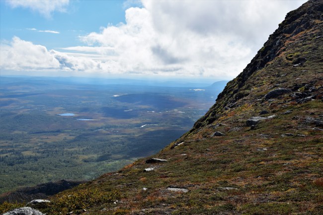 Jag hade en bit kvar till toppen och nu var jag rejält sliten på alla möjliga vis. Men att gå här uppe, helt ensam med alla dessa vyer, gav mig lite extra energi. Jag hade redan vid tre tillfällen trott att nästa krön var toppen. Men efter varje liten kulle kom det ett nytt krön och mer brant uppförsbacke. Här var jag glad att min svindel inte är på så hög nivå som för en del andra. Jag vågade inte gå för nära kanten och att dessutom känna att de starka vindarna kunde påverka balansen gjorde mig lite extra försiktig. Kullen ni ser där framme är den utsikt som utlovades efter 1,5 km. Men där svek mig min envishet. Den ser mindre ut här än den var när jag kom fram och jag kände att jag orkade inte med den sista ansträngningen. Jag skyllde på värk, trötthet, dålig kondition och la till svindelkänslor och starka vindar. Nu efteråt kan jag ångra att jag gav upp men jag vet att jag inte hade fått se något mer spektakulärt där uppe. På andra sidan låg dimma och moln fortfarande tjocka över fjällen och jag kände mig extremt nöjd med vad jag fick se ändå. Alla som vandrat i fjällen kan intyga att 1,5 km här inte är som att gå 1.5 km i ett plattare landskap. Det tog mig nästan två timmar att komma hit upp.