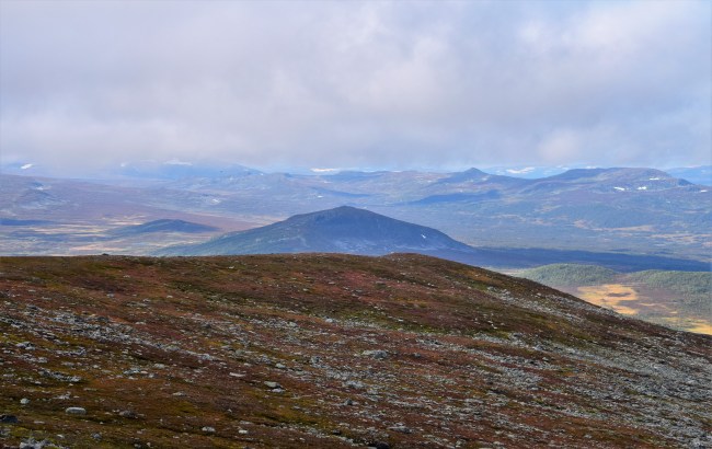 De låga molnen såg ut som dimmoln som brukar lätta när solen påverkar dem. Men när jag närmade mig Satsfjället såg det fortfarande ut så här. Inte så lovande om man vill se långt ut över fjällvärlden.