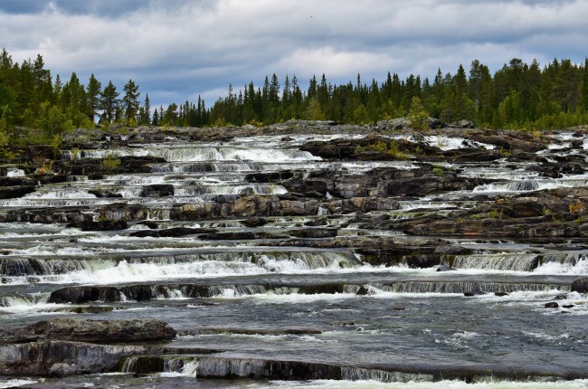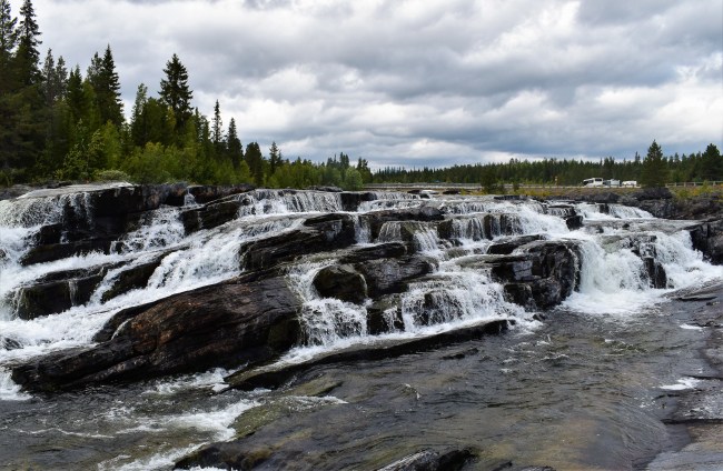 Jag fortsatte mot Trappstegsforsen och ni förstår nog varför den heter så. På parkeringen stod redan fyra stora husbilar och flera stativ med imponerande kamerautrustningar var uppställda med kameraägarna fullt fokuserade på forsen. Jag kände mig som lite udda när jag ställde min lilla bil bredvid de stora ekipagen och gick fram till forsen med min i sammanhanget enkla kamera. Men jag blev glatt bemött och vi pratade om tidigare besök här, hur det kan se ut ibland och om våra resrutter. Trevliga semesterfirare som mår bra är ofta välkomnande och delar gärna med sig av sina erfarenheter. Jag blev ändå glad när en annan bilist dök upp och tog fram sin mobil för att fota forsen.