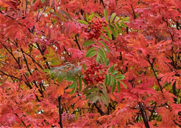 Igår såg jag bara rönnbär på de rönnar som fortfarande är gröna och när man ser den här bilden är det lätt att undra om det av någon anledning är just de fortfarande gröna grenarna som har bär. Någon skarpögd person ser kanske att det finns bär längst uppe i det vänstra hörnet men de hänger också från en grön kvist.