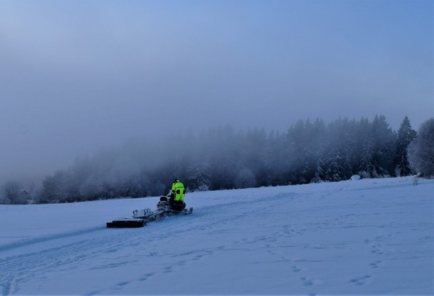 Nere i dimman igen och plötsligt kom en skoter med ett släp som breddade och förbättrade skidspåret. Själva skidspåret fanns redan men nu går det bra att åka fristil. Jag mötte en husse och hans hund på väg nerför en lång backe och snäll som jag är, eller kanske mer för att inte bli pååkt, klev jag ut i djupsnön. Den hunden hann jag inte heja på men tre andra vovvar mötte jag på en smal stig och då blev det vovvegos 😀