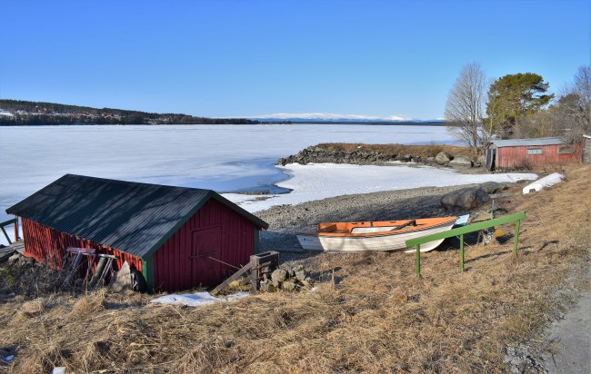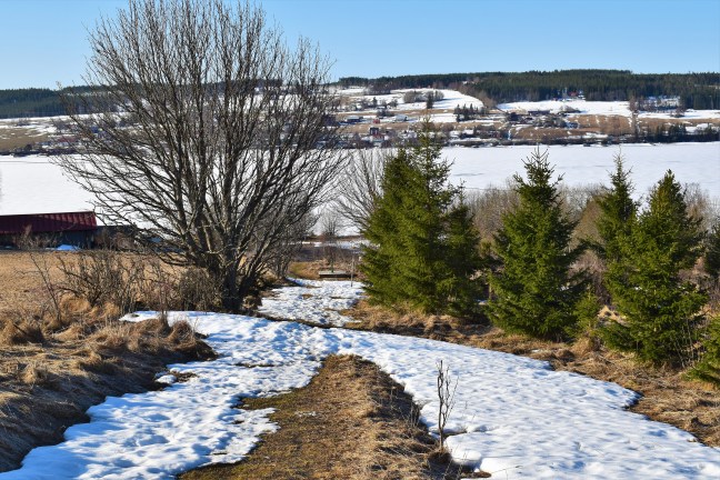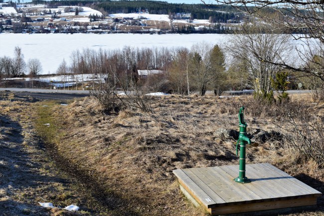 Jag testade att gå på stigar som jag har undvikit ett tag och valde så småningom en för mig ny stig ner mot sjön. Som ni ser är det fortfarande snö kvar bitvis och med hala lågskor fick jag ta det lite försiktigt om jag inte kunde gå på sidan av den hårda och hala snön. Långt där nere kan man skymta en brunn med en pump som får mig att tänka på Optand och en likadan pump där. I många år, ändå tills min man fixade dricksvatten in i huset, bar vi hinkar med just dricksvatten från denna pump och in i huset. Det var en viss teknik att få den att fungera och till slut la den av helt. Men då hade vi redan renoverat stugan, fixat renat vatten från sjön och flyttat dit permanent. Pumpen fick så klart stå kvar ändå, som ett minne från många somrar.