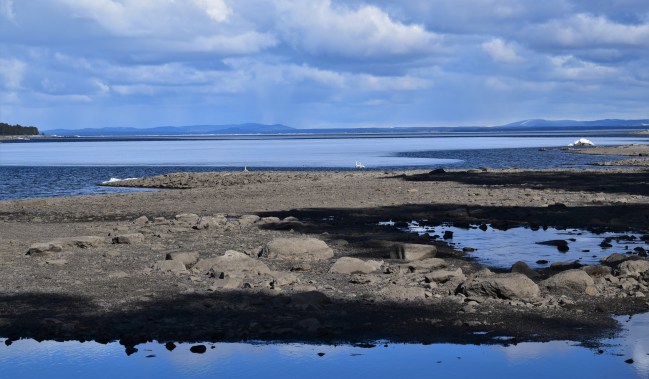 Det var verkligen upplyftande att få se något annat än mina vanliga rundor hemma på Frösön och att dessutom få gå på helt nya stigar fick mig att le inombords. Hela två plusgrader var det och inte särskilt mycket blåst. En fin dag och en härlig runda. Vattennivån är fortfarande väldigt låg och en stor del av de stränder som syns kommer snart att vara täckt av vatten. Jag såg en liten klippa, som under sommaren är en liten ö, och kunde inte motstå att gå ut till den och ställa mig på toppen.