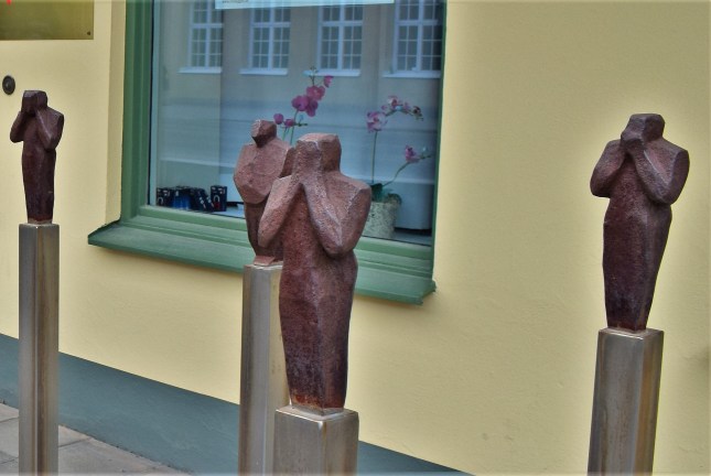 Men när vi tittade lite närmare såg vi att i ledet längst bak fanns tre gubbar med det välkända temat ”ser inget, hör inget, säger inget”. Det är svårt att se på bilden men gubben längst till vänster håller för öronen. Det var den gubben vi la märke till först och eftersom vi spekulerade kring om samlingen skulle föreställa en kör skrattade vi åt att han stod och höll för öronen. Sedan såg vi de andra två och det blev vi inte klokare av.