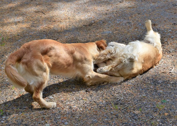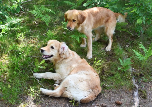 Vad roligt de här två har med varandra och vad mycket spännande de hittar på i skogen. Rätt som det var dök båda två ner och doppade sig helt och hållet i ett dike med lersörja. Min kompis tog det med ro och vi gick vidare tills hon visade med handen och sa till sina hundar att springa och doppa sig i en liten sjö. Vi såg inte ens sjön men hundarna sprang glatt iväg och efter en stund kom de lika glatt springande tillbaka mycket renare.
