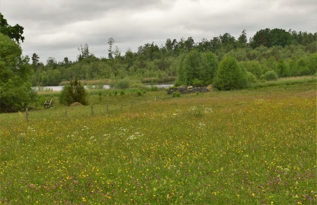 Jag lyfte kameran i farten för att försöka fånga glimten av sjön och den lilla ruinen bakom blomster- och kohagen.