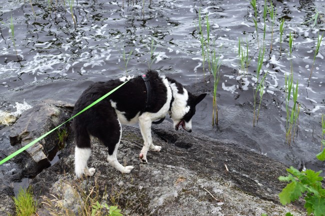 Vi såg inte till några kor och efter en stund var vi ute ur hagen och hittade stigen vi ville följa. På några ställen kom vi ner till en sjö och det gillade Roddy.