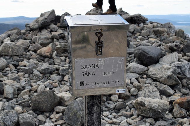 På tisdagen startade vi med en hotellfrukost, den enda på vår resa. Bor man på hotell så är frukosten något av det man brukar se fram emot men vi som är veganer hittar oftast inte lika överdådiga uppläggningar som vi gjorde förr, när vi var köttätare. Vi fick ändå ihop en ganska bra frukost så vi var mätta och nöjda när vi gav oss iväg på toppturen på fjället Saana. Högsta punkten på fjället nedan var vårt mål.