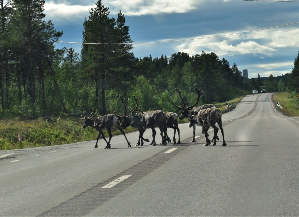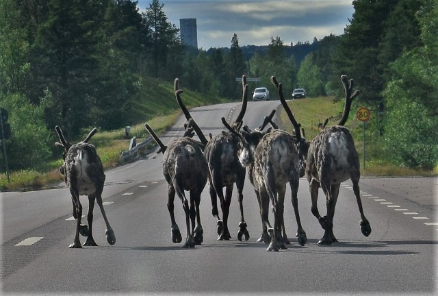 Vi lämnade Kilpisjärvi med en bra känsla efter en häftig upplevelse. Vårt nästa boende fanns utanför Kiruna och strax innan vi kom dit hann vi ikapp några renar som lunkade fram på vägen. De verkade inte särskilt stressade av trafiken utan fortsatte målmedvetet rakt fram…