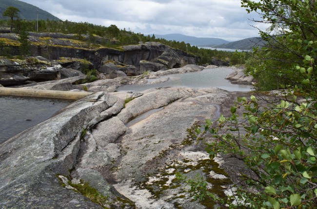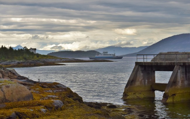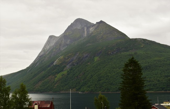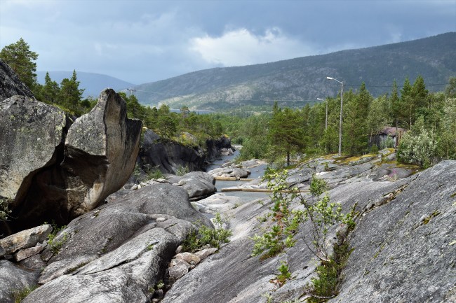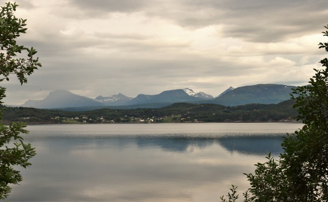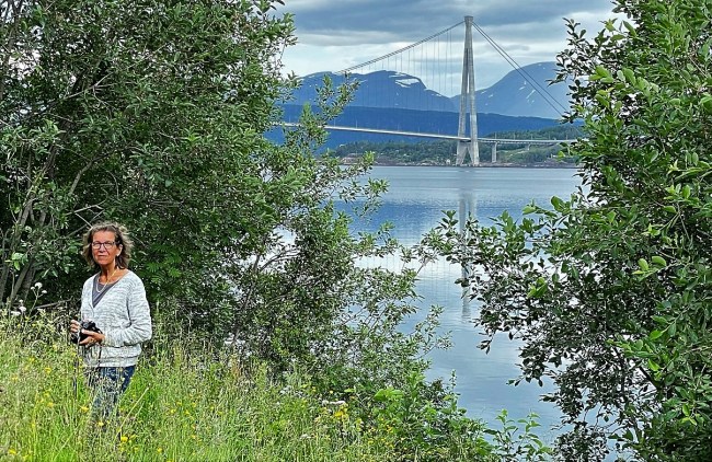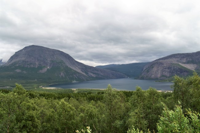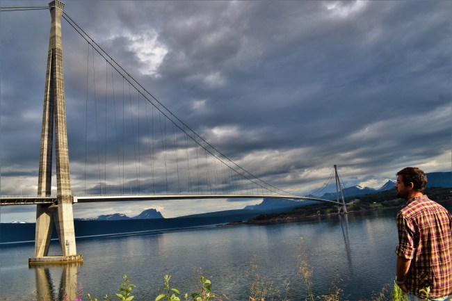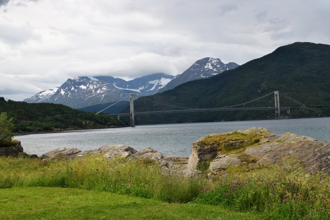 Vi hade en väldigt fin lägenhet i Narvik och inte behövde vi tänka på städning heller. Vi diskar alltid upp efter oss och torkar av ytorna i köket men båda boendena i Norge hade en städavgift inkluderad i priset. Ganska skönt men vi är både snabba och effektiva när vi ska lämna ett boende. Det är alltså inte särskilt betungande att lämna boendena i samma skick som när vi kom. Det hängde regn i luften och tidvis var det väldigt disigt men vi såg tillräckligt av fjällen för att bli nöjda. Jag kan redan nu varna för att det kommer en hel drös bilder med fjäll som motiv. Vi hade inga uppgjorda planer för dagen mer än att vi ville se så mycket vacker natur som möjligt och att stanna till när vi såg något fint. Vi hann inte långt innan vi stannade för att se lite närmare på den bro vi såg från lägenheten.