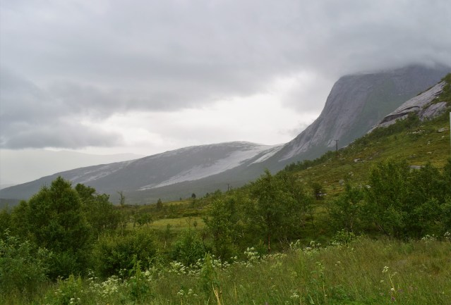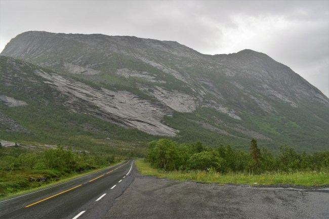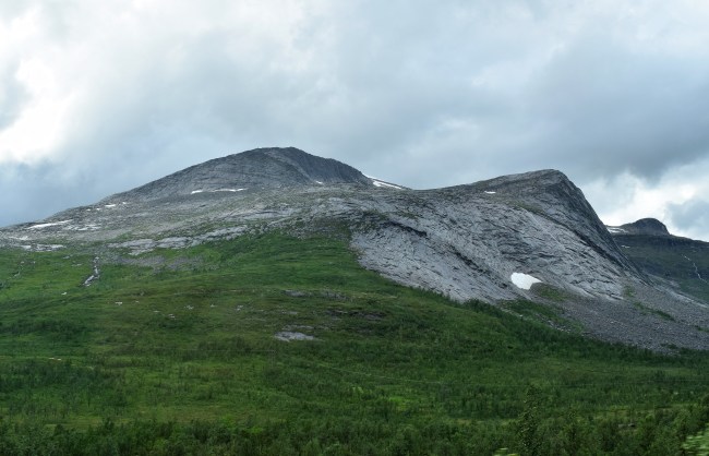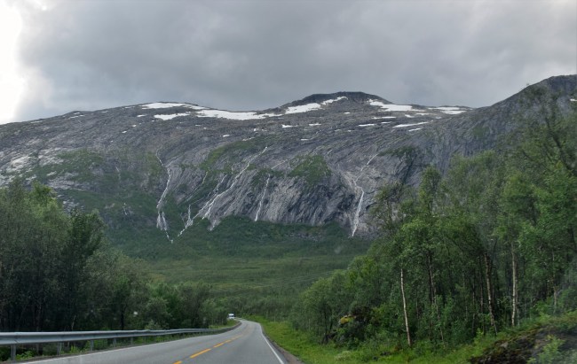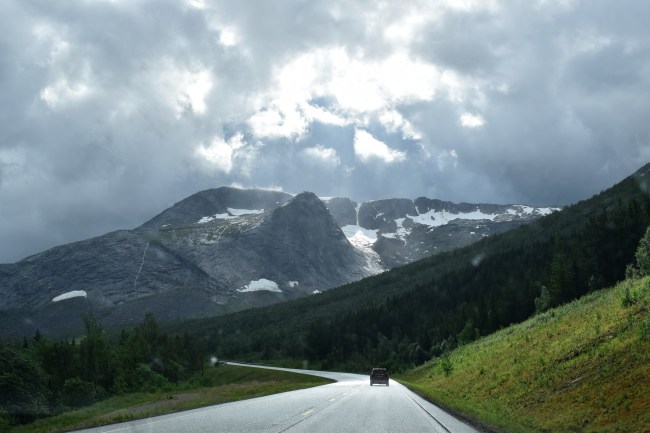 Nästan alla fjällbilder är tagna från bilen under färd. Ibland gör regndroppar att det blir vita, suddiga fläckar men jag är ändå ganska nöjd med att det funkade så bra som det gjorde. Eftersom jag inte hade hunnit få mitt nya körkort innan vi åkte så tyckte både jag och min son att det var bäst att han fick köra genom Finland och Norge. Jag frågade polisen i gränskontrollen om det var ok att jag körde när jag bara hade passet med mig. Han sa att det skulle fungera och att de kunde kontakta svenska polisen om jag skulle bli stoppad. Men det krånglet ville vi inte ha så då var jag passagerare, och kunde fota, genom hela Norge.