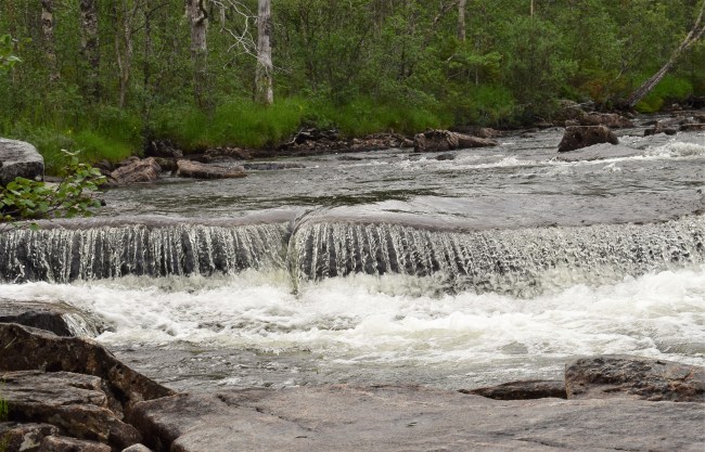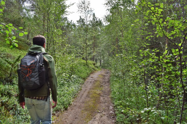 Vi ville väldigt gärna hitta någonstans där vi kunde ta en lite mer rejäl promenad och plötsligt dök det upp en liten parkering med en skylt om en vandringsled. Vi visste inte hur lång den var eller vart den skulle leda oss men det spelade inte så stor roll. Vi konstaterade att vi förmodligen antingen skulle komma upp på ett fjäll eller till en sjö där den fors vi hörde började. Det var tack och lov en ganska lätt vandring och det var precis vad min kropp behövde den här dagen.