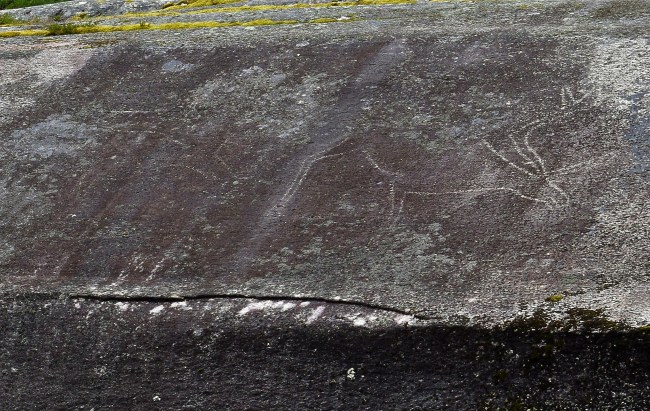 En hällristning fanns i berget men det var väldigt otydliga ristningar. Men den ena renen kan man fortfarande se. Jag gjorde som skylten sa och tittade från olika håll men bättre än det resultat ni ser i bilden under den här blev det inte.