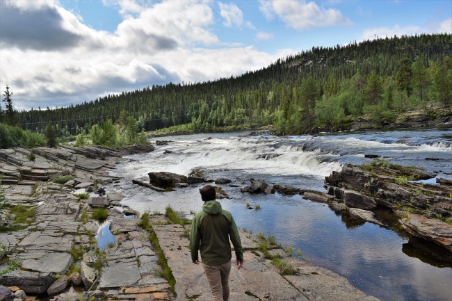 Från stugan i Blattniksele, utanför Sorsele, styrde vi mot Vildmarksvägen. Det är inte ens ett år sedan jag gjorde en resa på egen hand längs den vägen och då bodde jag fyra nätter på olika platser. Nu kom vi in på Vildmarksvägen strax innan Trappstegsforsen och därifrån åkte vi motsatt håll mot hur jag gjorde min resa i höstas. Men det blev ändå något av en repris eftersom vi både besökta samma platser och bodde på samma vandrarhem som jag gjorde då. Vi har båda sett Trappstegsforsen ett antal gånger och var nog ganska nära att bara åka förbi. Men min son hade inte sett hur den fortsätter på andra sidan vägen och visste inte att man kan vandra på klipporna för att se den. Därför stannade vi ändå till en stund.