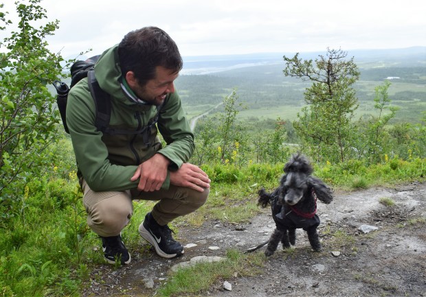 Vi var fikasugna redan innan vi började gå och bestämde oss för att stanna på den grill- och utsiktsplats jag visste fanns bara en liten bit upp. Där satt det redan ett par med en hund men de såg ut att vara på väg att gå så vi stannade till, pratade lite och fick mysa en stund med deras lilla vovve. Hon gick glatt fram och tillbaka mellan oss, glad för all uppmärksamhet.
