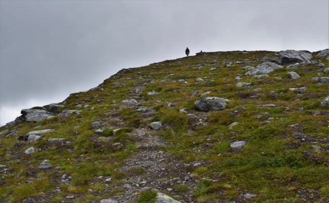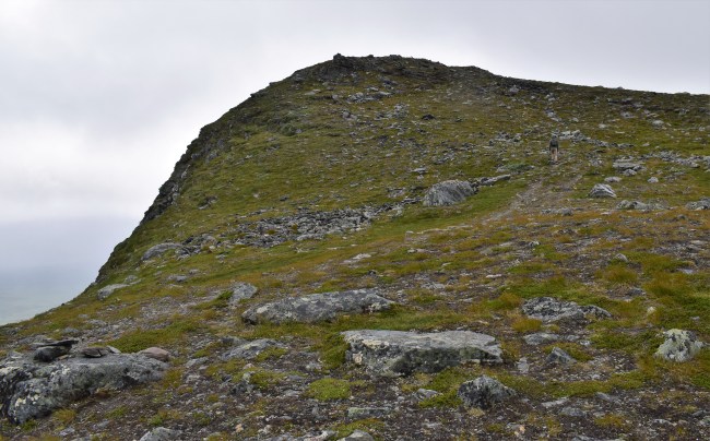 Det här är i alla fall sista biten upp till toppen. Men i den blåst, som gjorde allt för att motarbeta oss, kändes vägen upp oändligt lång. Om ni tittar noga ser ni min son en bit upp men han är klädd i samma färger som fjället.