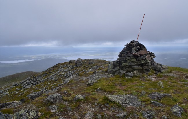 Innan vi checkade in i vårt rum blev det ännu ett återseende och en chans till revansch. I höstas vandrade jag upp på Satsfjället och for sedan vidare mot Trappstegsforsen. Den här dagen blev det omvänd ordning men ändå likadant. Skillnaden var vädret. Sist jag var här var toppen dold av molnen men medan jag tog mig upp sprack det upp och solen tittade fram mellan de moln som stannade kvar. Nu var det disigt och grått hela tiden. Blåste gjorde det då också men nu var det stormstyrka i byvindarna. Leden går först lite snett upp tills den kommer upp ovanför trädgränsen. Sedan går den snett upp till höger för att sedan följa kanten åt andra hållet tills man når toppen. Förra gången var jag så slut att jag inte orkade bry mig om att försöka klara av den sista knixen. Det har inte gnagt särskilt mycket i mig men när min son frågade mig om jag ville ha revansch så kände jag att det ville jag.