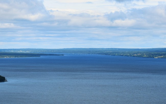 Långt där borta i allt det blå kan man ana att det finns en bro. Sannsundsbron åkte vi nästan alltid på när vi skulle ta oss från vårt hem i Oviken till Östersund. Vintertid kunde vi periodvis ta en isväg som gjorde resan kortare men bron var det vanligaste alternativet.
