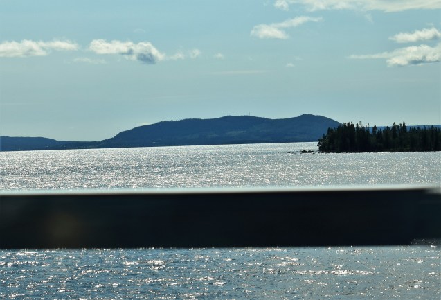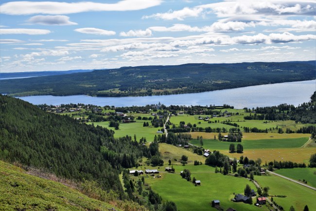 Vi följde en led som efter ett tag delade sig och vi valde att gå motsols. Vi kom alltså först till den östra sidan av berget och kunde se ut över den här delen av Storsjön. Så lägligt det här bordet och bänkarna dök upp. Precis när det var lagom tid för en lunchpaus.