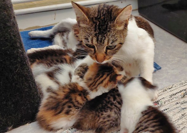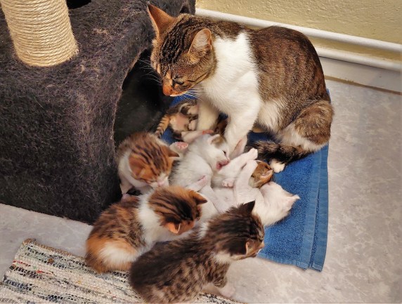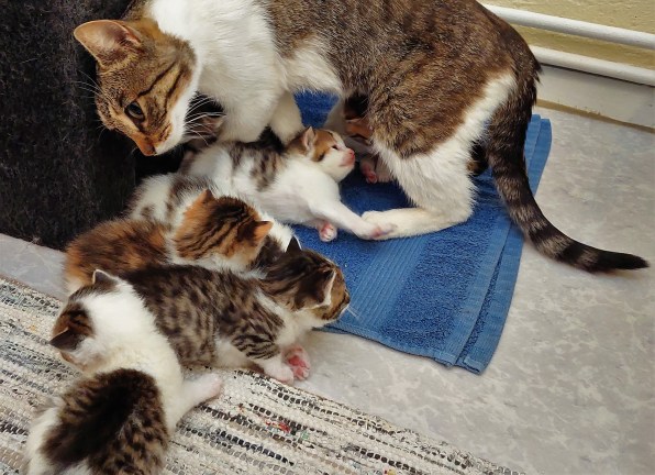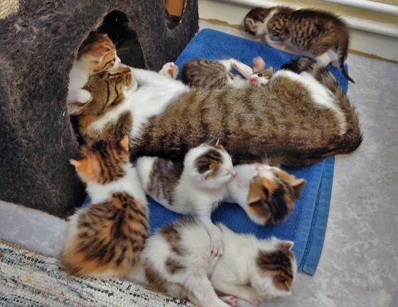 Ljuvliga bilder på kattfamiljen – och vilken duktig kattmamma! Bra om hon kan få komma hem igen, hopas kattägaren betalar för sig!