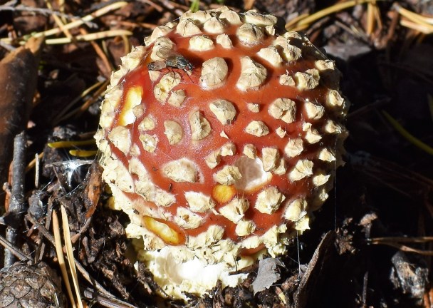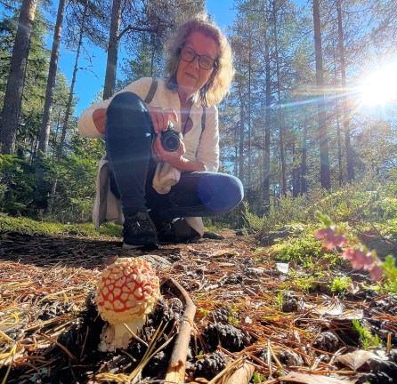 En fluga på en flugsvamp och en Ingrid framför samma flugsvamp.