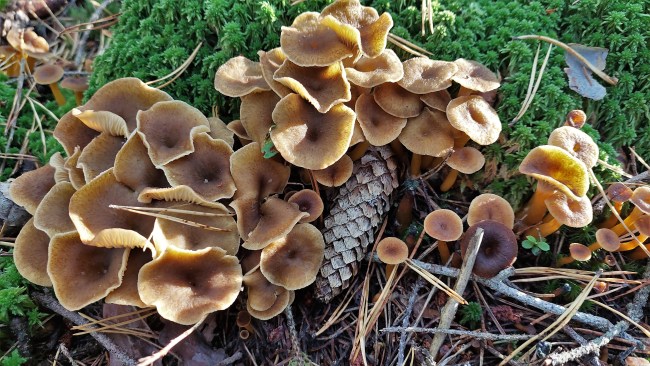 Vi letade inte efter svamp men längs stigarna såg vi en hel del taggsvampar, fårtickor, några smörsoppar och en tegelkremla. Min son tyckte att det var kul att lära sig om dessa svampar och vi stoppade ner dem i en tygkasse som han hade i ryggsäcken. Vi hade inga ambitioner att försöka hitta trattisar eller kantareller men så plötsligt, när vi hade stannat till av någon anledning, tittade jag lite åt sidan och där växte några få trattkantareller. De hamnade bland de andra svamparna eftersom vi inte trodde att det skulle bli mycket mer än så.