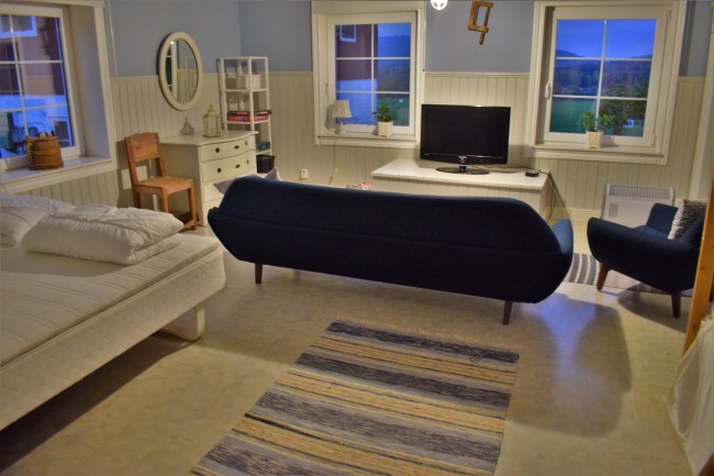Här var det just en appletv (???) så jag tittade på rapport på datorn och var nöjd med det. Jag tyckte om den här stugan men jag kan inte förstå varför det är så vanligt med låga ryggstöd. Jag kan helt enkelt inte sitta i en soffa eller fåtölj som ser ut så här. Om den står mot en vägg kan jag lägga en kudde ovanför ryggstödet mot väggen och få stöd för bröstrygg och nacke. Men jag får ont bara av att tänka på att sitta i en soffa som den här. Det var inga problem. Jag bäddade den sköna sängen och bullade upp med några kuddar bakom rygg och nacke. Där satt jag bra.