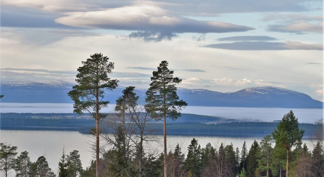 Jag fick ingen bra bild på fjällen men man kan i alla fall se att det finns lite snö på vissa platser. Framför fjällen, över den delen av sjön, låg markdimman fortfarande tjock. Det är inte så lätt att se skillnaden mot den del av sjön där vattnet syns och i det här fallet ser ögonen både längre och tydligare än kameran.