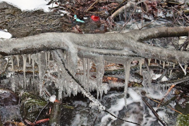 Det har inte kommit mer snö men minusgrader gör att is har bildats på en gren över Mjällebäcken. Det skvätter upp vatten från bäcken och ju längre in i vintern vi kommer desto mer is bildas på grenen.