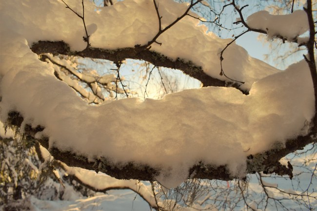Men det är klart att jag ville ut i finvädret och efter lunch åkte förutom jacka och kängor även långkalsongerna, varm mössa och en lika varm halsduk (som min äldsta dotter virkat åt mig) på och väskan med kameran hängde så klart också med. Det blåser lite i dag så en del av snön på träden kommer nog att försvinna. Men just nu ser det ut så här.
