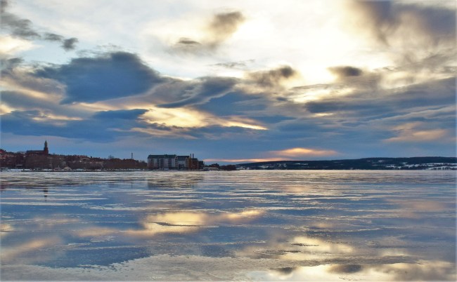8. Hela vintersäsongen hittills har bestått av halkvarningar. Jag har aldrig gått bara i mina icebugs någon tidigare vinter utan kunnat variera lite. Nu är det inget jag ens överväger! sparken är helt omöjlig att använda också, tyvärr. När det är halkigt i terrängen går jag mycket hellre uppför, då får man grepp på isen mycket bättre än när man ska rutscha nerför. Minst lilla lut neråt så förvandlas jag till pingvin…. Ett ljuvligt foto blev det av vattnet ovanpå isen i kombo med blå himmel och moln! Såg idag en ute på sjöisen som vindsurfade (kanske heter det något annat då man är på is??)