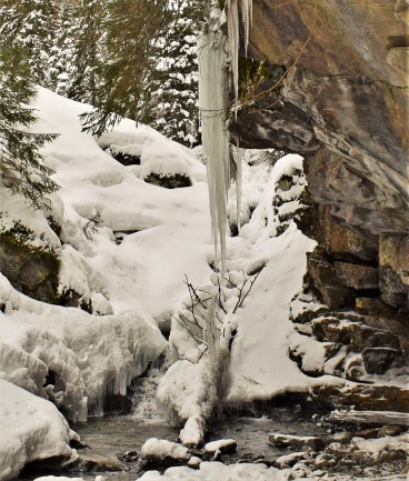En delvis frusen bäck och rejäla istappar efter regn och smältande snö.