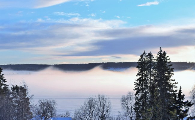 Vilken härlig bild där dimman liksom for omkring som vågor. Något sådant har jag aldrig sett. Även jag går på isen eller åker spark för Kinabror har plogat upp en väg mellan mig och hans sommarstuga så Jack och jag kan gå där istället för på vägen där det ibland kommer timmerbilar och stör. Dessemellan sitter vi och tittar på tv. Jag tittar bara på skidskytte men brorsan tittar på allt.