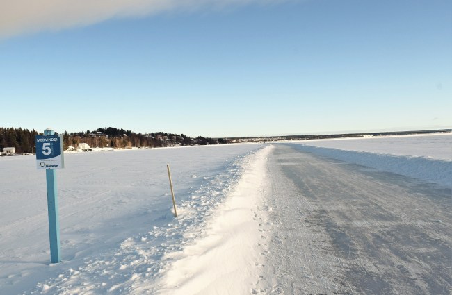 I stället tog jag mig ner till sjön lite tidigare än jag hade tänkt och där fortsatte jag på Medvinden hem till mig. På skylten står det 5 km på båda sidorna och eftersom jag igår såg en skylt där det stod 4 km på ena sidan och 6 km på andra sidan, antar jag att Medvinden är ca en mil lång. Det ser ut som om jag var ensam på isen men rätt som det var kom det några skridskoåkare, sparkåkare och en del andra som antingen körde om mig eller mötte mig. Men jämfört med i helgen var det mycket färre personer ute. Här syntes det inte alls att det hade snöat så antingen hade snön redan plogats bort eller så har den blåst åt sidan. Jag gissar på att snöröjarna startade tidigt. Men vinden har också påverkat landskapet genom att blåsa bort den snö som föll på träden i natt.