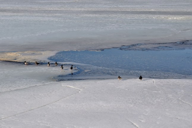 Änderna blir glada när isen spricker upp på vissa ställen. Här rinner Mjällebäcken ut och snart börjar harrarna simma upp i den för att leka. Kanske har de redan hittat dit.